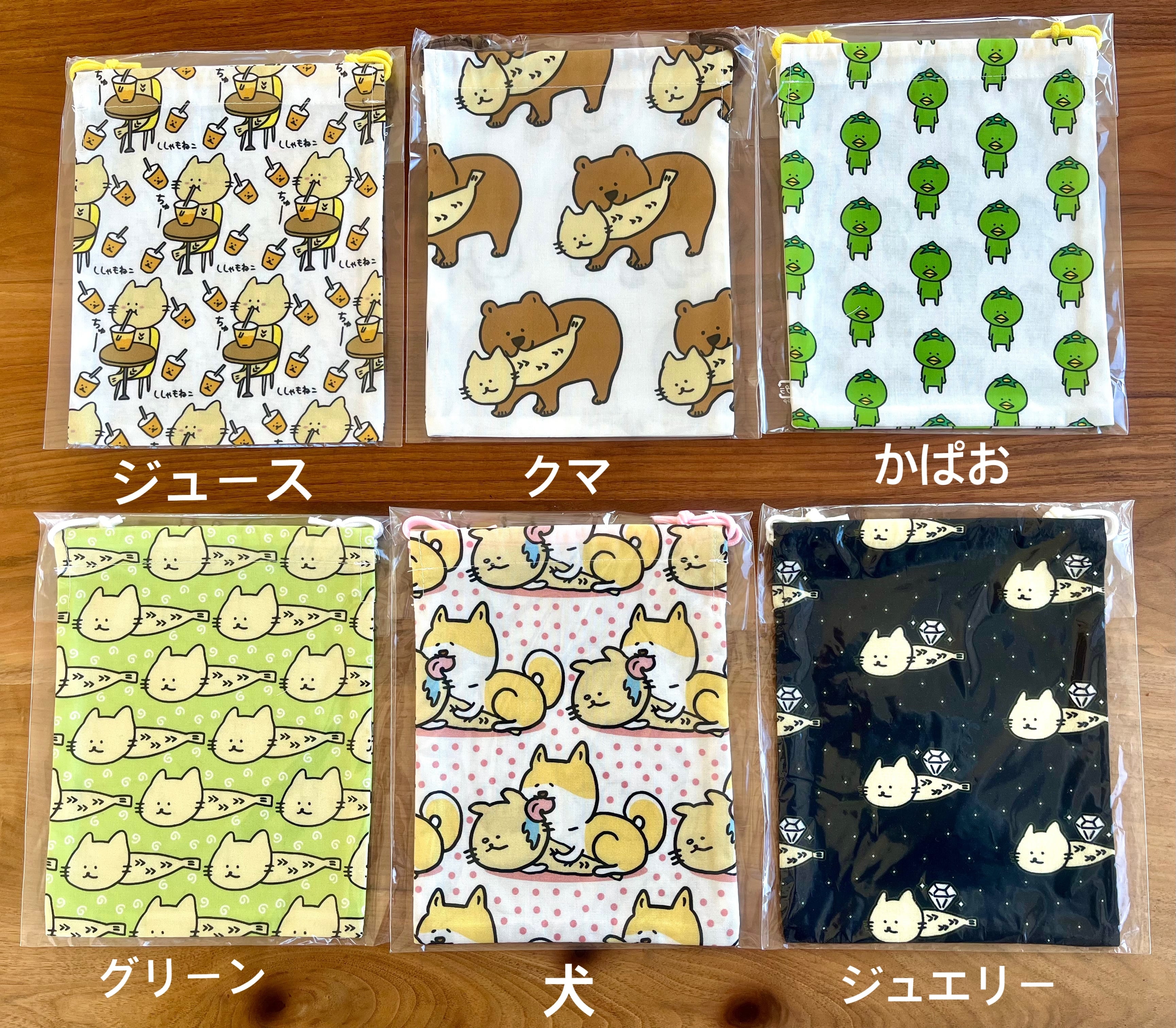 さまざまなイラストの巾着袋。
